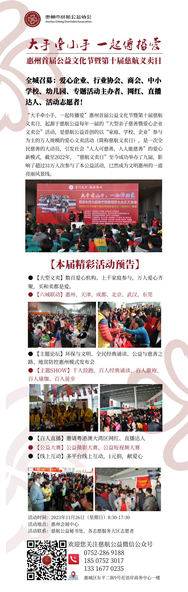 “大手牵小手,一起传播爱”——慈航义卖日,是全国收个多元主体共同参与公益的爱心新模式,得到了很多政府相关部门、学校、幼儿园、惠州本土企业等的大力支持和参与,经过十多年深耕,影响了超过31万人次参与公益活动,深受社会各界好评,已然成为文明惠州的一道亮丽风景线。义卖活动所筹善款,将用于帮困助残、关爱儿童、乡村振兴等公益项目。