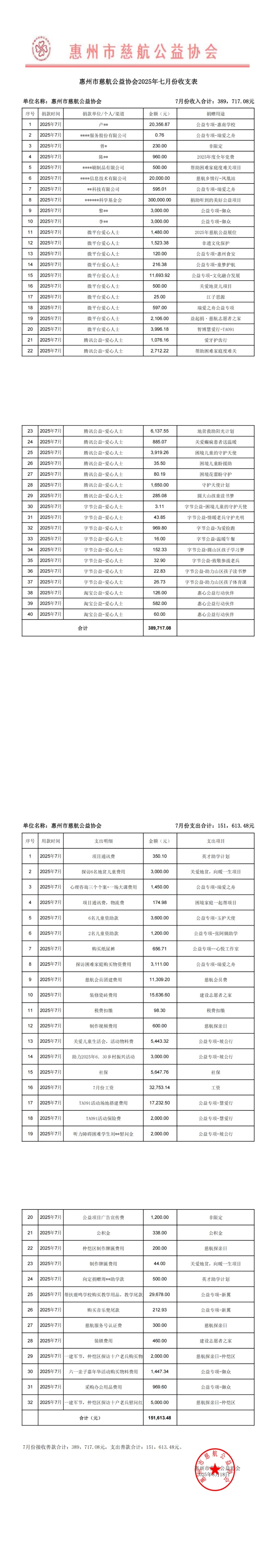 概要:截至2025年7月31日收到善款合计:389,717.08元;截至2025年7月31日支出善款合计:151,613.48元。