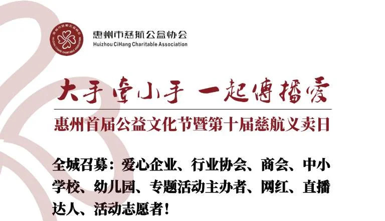 “大手牵小手·一起传播爱”惠州首届公益文化节暨第十届慈航义卖日活动,将于2023年11月26日8:30-18:30在惠州江北会展中心1、2号展馆举行。本次活动由惠州市民政局、惠州市卫健局指导,惠州市慈航公益协会、惠州市社会组织总会、惠州市社会组织创新服务基地共同主办。义卖活动所筹善款,将用于帮困助残、关爱儿童、乡村振兴等公益项目。该活动源于惠州市慈航公益的“慈航义卖日”项目,这是全国首个以家庭、